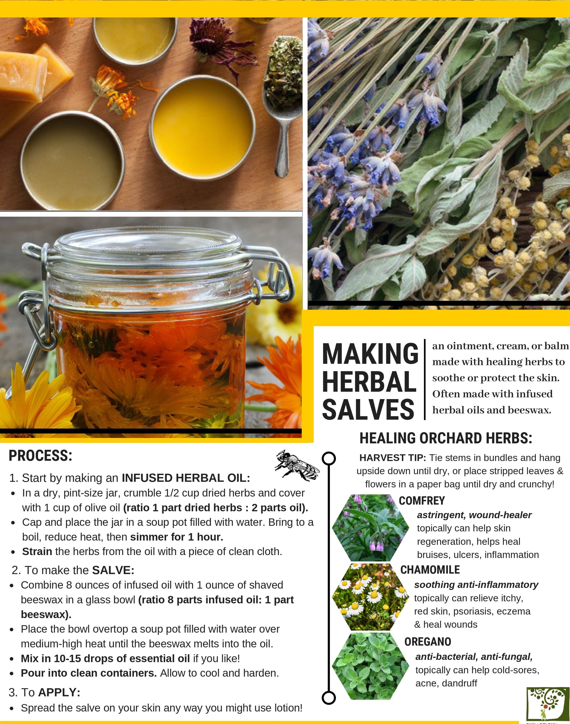 The Herbal Salve is hand-made in small batches to ensure superior quality. Our herbs are grown in harmony with nature – no chemicals. They are respectfully harvested by hand and air-dried to retain peak potency. Dried herbs are infused in Extra Virgin Olive Oil using only solar heat to retain potency. Once decanted, the oil is mixed with pure beeswax from a local source.